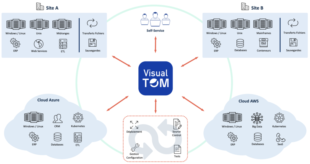 Visual TOM – la plateforme On-premise ou SaaS, dédiée à l’automatisation des tâches et à l’orchestration de processus – du datacenter local avec des systèmes hérités jusqu’au cloud.